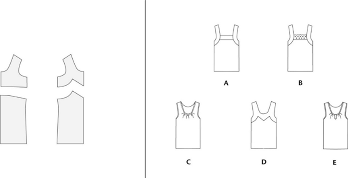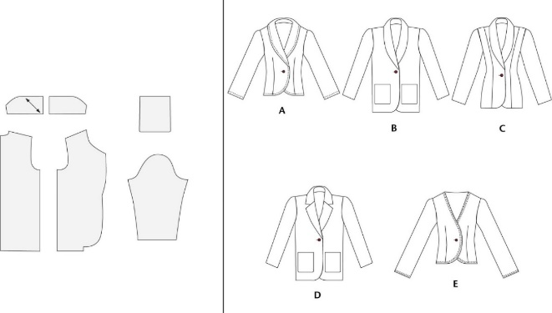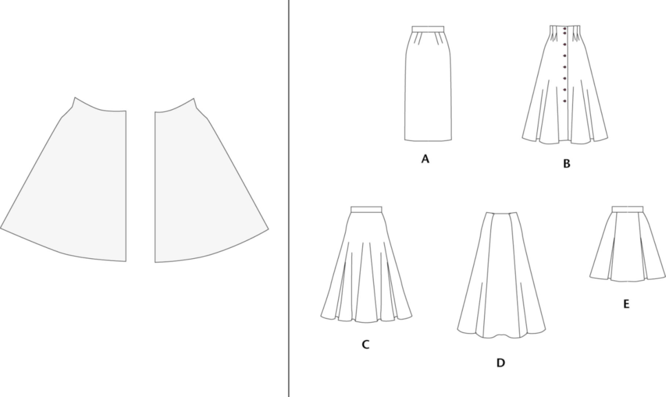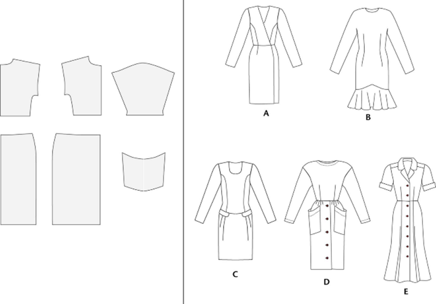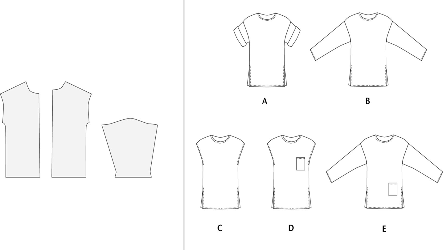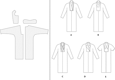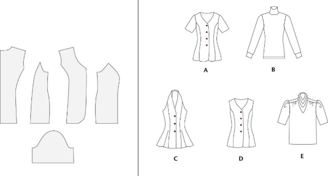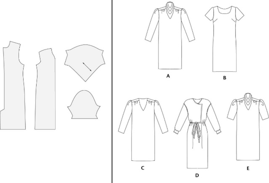 The following section consists of 10 sets of pattern pieces, which can be constructed, in fabric to create a garment. To the right of each set of pattern pieces there are sketches of some garments. You are to decide which one of these garments can be made from the pattern pieces shown. The sketch always shows the outside, front view of the garment. In every group there is only one correct garment sketch. Show your choice by selecting the lettered button, which is the same as that of the garment you have chosen.